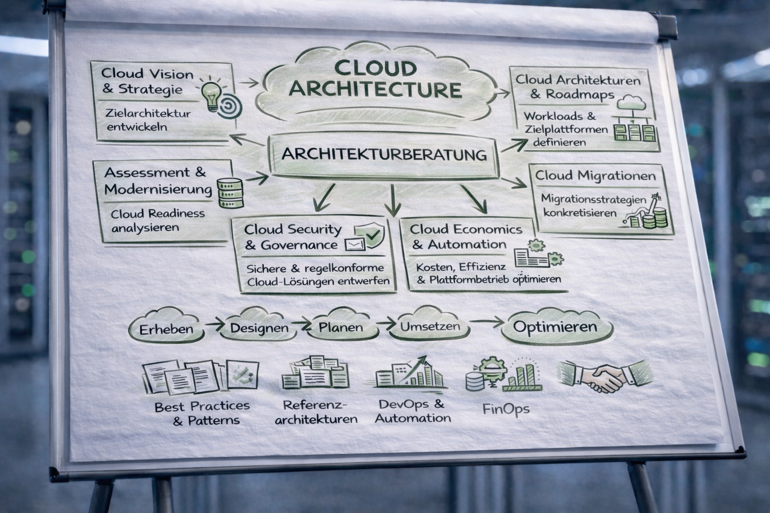 Themen in der Cloud Architektur – visualisiert mit Unterstützung von KI.